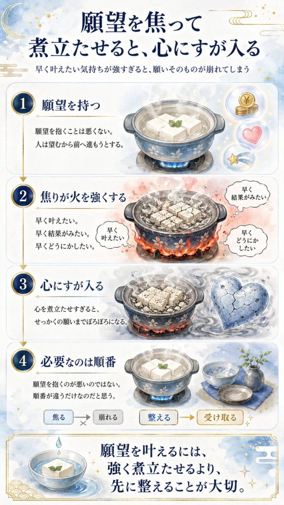 願望も、焦って火を強くしすぎると、心にすが入る。